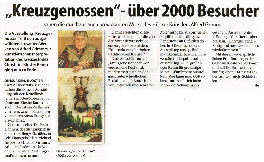 Zentrumsleiter Dr. Peter Hahnen, der die umstrittene Schau des Beuys-Schülers in sein Haus geholt hat, zieht eine positive Bilanz: “Grimms Arbeiten forderten die Besucher zur eigenen Stellungnahme heraus. Damit erreichten diese Kunstwerke mehr als die von den Vorbesitzern achtlos entsorgten oder auf dem Flohmarkt verscherbelten traditionellen Kreuze.“