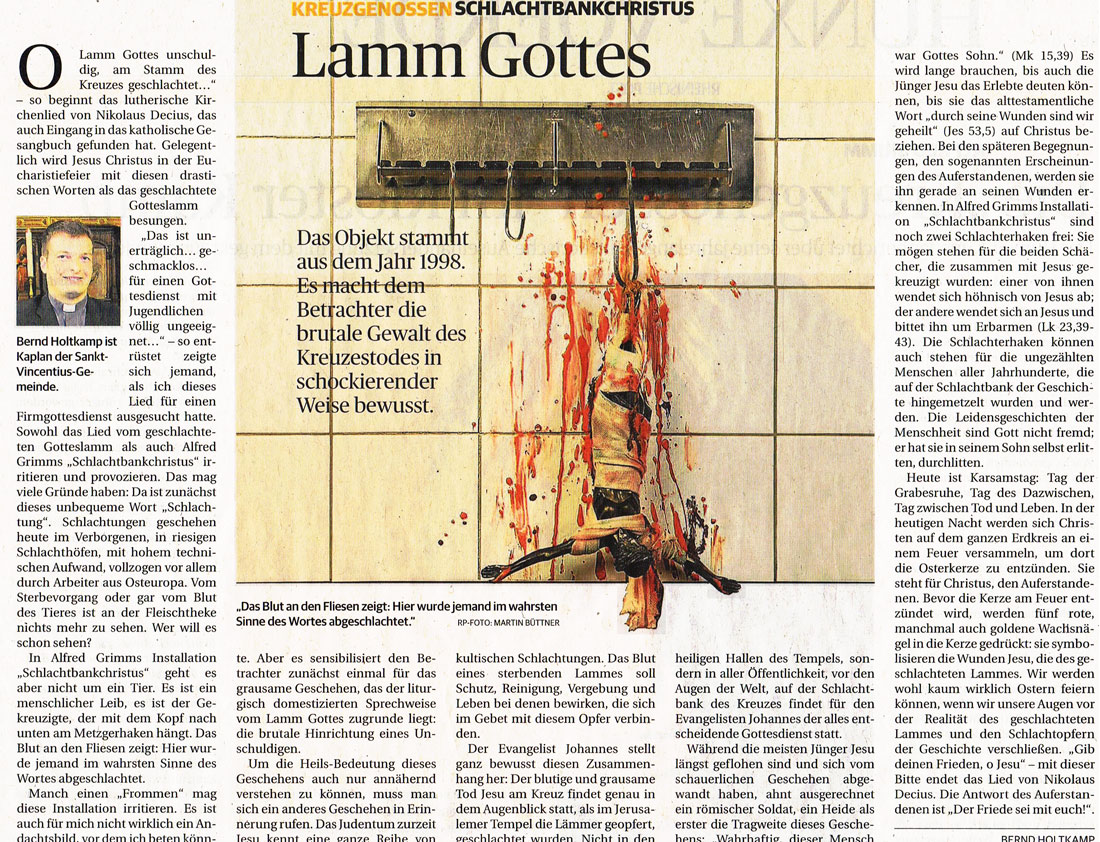 Manch einen „Frommen“ mag diese Installation irritieren. Es ist auch für mich nicht wirklich ein Andachtsbild, vor dem ich beten könnte. Aber es sensibilisiert den Betrachter zunächst einmal für das grausame Geschehen, das der domestizierten Sprechweise vom Lamm Gottes zugrunde liegt: die brutale Hinrichtung eines Unschuldigen.