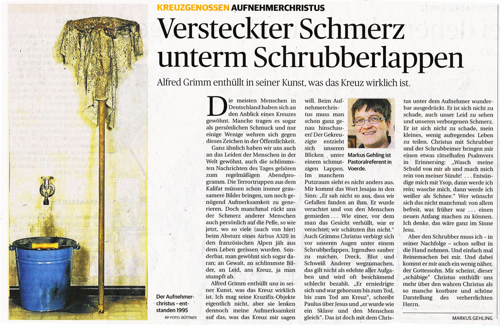 Alfred Grimm enthüllt uns in seiner Kunst, was das Kreuz wirklich ist. Ich mag seine Kruzifixe eigentlich nicht, aber sie lenken meine Aufmerksamkeit auf das, was das Kreuz mir sagen will. Beim Aufnehmerchristus muss man schon genauer hinschauen! Der Gekreuzigte entzieht sich unsren Blicken unter einem schmutzigen Lappen. In manchem Putzraum sieht es nicht anders aus. Mir kommt das Wort Jesajas in den Sinn: „Er sah nicht so aus, dass wir Gefallen fanden an ihm. Er wurde verachtet und von den Menschen gemieden… Wie einer, vor dem man das Gesicht verhüllt, war er verachtet; wir schätzen ihn nicht.“ Auch Grimms Christus verbirgt sich vor unseren Augen unter einem Schrubberlappen. Irgendwo sauber zu machen, Dreck, Blut und Schweiß anderer wegzumachen, das gilt nicht als edelste aller Aufgaben und wird oft beschämend schlecht bezahlt. „Er erniedrigte sich und war gehorsam bis zum Tod, bis zum Tod am Kreuz“, schreibt Paulus über Jesus und „er wurde wie ein Sklave und den Menschen gleich“. Das ist doch mit Christus unter dem Aufnehmer wunderbar ausgedrückt. Er ist sich nicht zu schade, auch unser Leid zu sehen und unseren verborgenen Schmerz. Er ist sich nicht zu schade, mein kleines, wenig aufregendes Leben zu teilen. Christus mit Schrubber und Schrubbereimer bringen mir einen etwas rätselhaften Psalmvers in Erinnerung: „Wasch meine Schuld von mir ab und mach mich rein von meiner Sünde!...Entsündige mich mit Ysop, dann werde ich rein; wasche mich, dann werde ich weißer als Schnee.“ Wer wünscht sich das nicht manchmal: von allem befreit, was früher war… einen neuen Anfang machen zu können. Ich denke, das wäre ganz im Sinne Jesu.