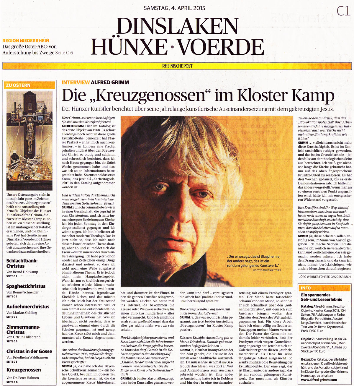 Katalog Alfred Grimm, Kruzifix-Objekte, Kloster Kamp 2015, 104 Seiten, 76 Abbildungen in Farbe, Biografie, Portraitfoto, Ausstellungsübersicht, kunsthistorischer Text von Dr. Bernd Krysmanski, Preis 19,50 Euro