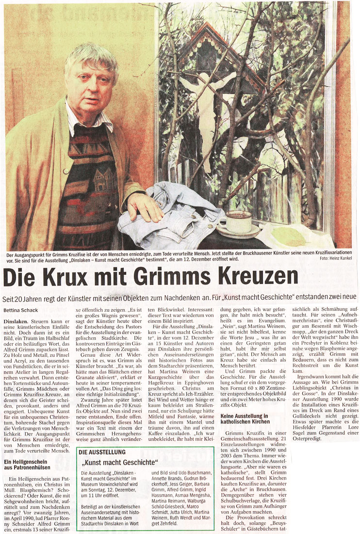 Dinslaken. Steuern kann er seine künstlerischen Einfälle nicht. Doch dann ist es ein Bild, ein Traum im Halbschlaf oder ein beiläufiges Wort, das Alfred Grimm zupacken lässt. Zu Holz und Metall, zu Pinsel und Acryl, zu den tausenden von Fundstücken, die er in seinem Atelier in langen Regalreihen verwahrt. Dann entstehen Tortenstücke und Autounfälle, Grimms Mädchen oder Grimms Kruzifixe. Kreuze, an denen sich die Geister scheiden, provokant, anders und engagiert. Unbequeme Kunst für ein unbequemes Christentum, bohrende Stachel gegen die Verletzungen von Menschlichkeit. Der Ausgangspunkt für Grimms Kruzifixe ist der von Menschen erniedrigte, zum Tode verurteilte Mensch.