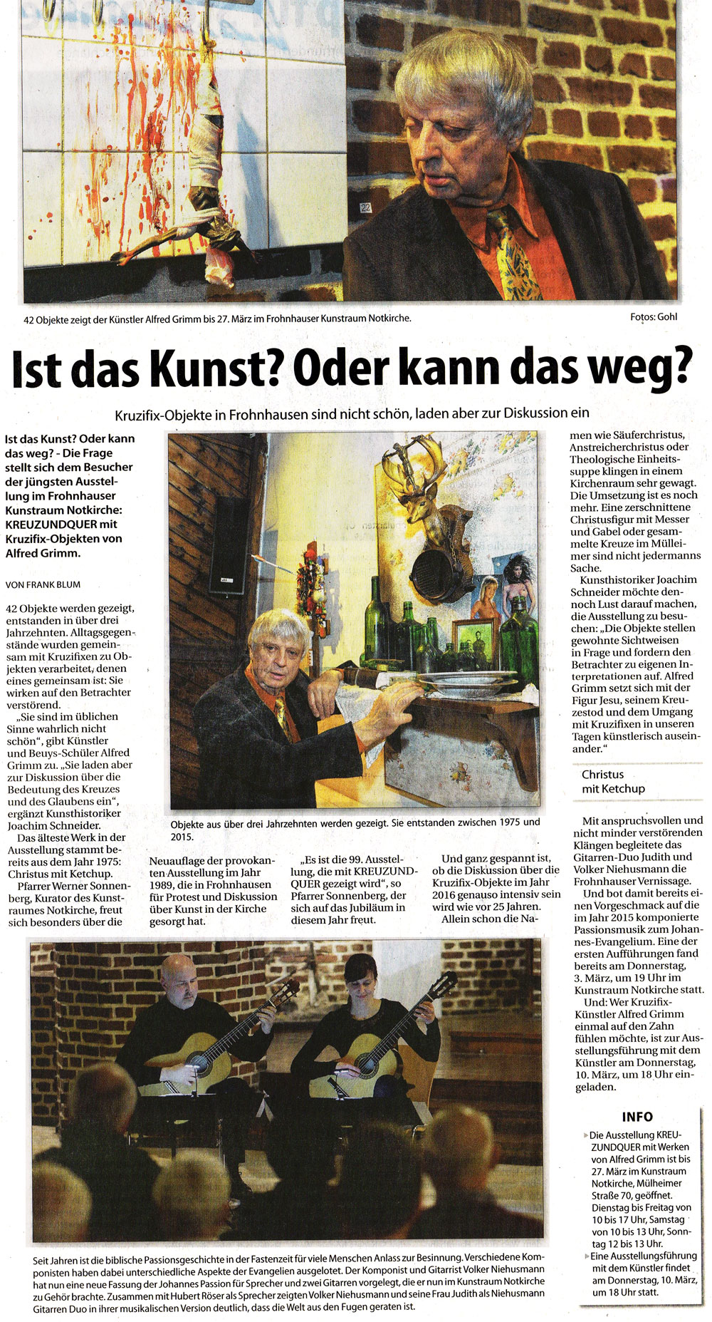 Mit anspruchsvollen und nicht minder verstörenden Klängen begleitete das Gitarren-Duo Judith und Volker Niehusmann die Frohnhauser Vernissage.?Und bot damit bereits einen Vorgeschmack auf die im Jahr 2015 komponierte Passionsmusik zum Johannes-Evangelium. Pfarrer Werner Sonnenberg: „Eine der ersten Aufführungen wird am Donnerstag, 3. März, um 19 Uhr im Kunstraum Notkirche stattfinden.“