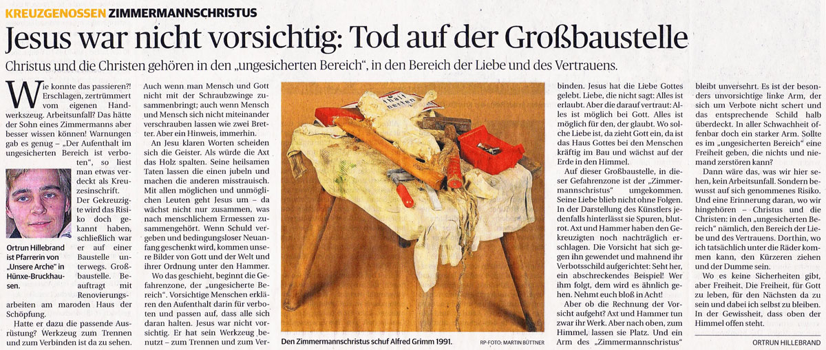 Wie konnte das passieren? Erschlagen und zertrümmert vom eigenen Handwerkszeug. Arbeitsunfall? Das hätte der Sohn eines Zimmermanns aber besser wissen können! Warnungen gab es genug – „Der Aufenthalt im ungesicherten Bereich ist verboten“, so liest man etwas verdeckt als Kreuzesinschrift. Der Gekreuzigte wird das Risiko doch gekannt haben, schließlich war er auf einer Baustelle unterwegs. Großbaustelle. Beauftragt mit Renovierungsarbeiten am maroden Haus der Schöpfung.