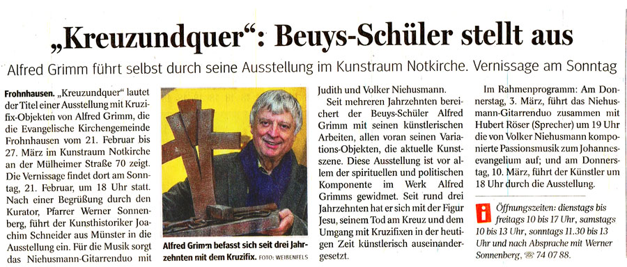 Frohnhausen. „Kreuzundquer“ lautet der Titel einer Ausstellung mit Kruzifix-Objekten von Alfred Grimm, die die Evangelische Kirchengemeinde Frohnhausen vom 21. Februar bis 27. März im Kunstraum Notkirche an der Mülheimer Straße 70 zeigt. Die Vernissage findet dort am Sonntag, 21. Februar, um 18 Uhr statt. Nach einer Begrüßung durch den Kurator, Pfarrer Werner Sonnenberg, führt der Kunsthistoriker Joachim Schneider aus Münster in die Ausstellung ein. Für die Musik sorgt das Niehusmann-Gitarrenduo mit Judith und Volker Niehusmann.